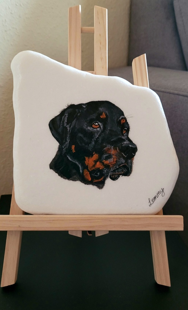 Ich bemale Steine, Leinwände, Dachziegel usw mit ihrem Wunschmotiv. Gemalt wird mit Pinsel, Acrylfarben und Acrylstiften. Zum Schluss wird mit Lack versiegelt sodas der Stein auch für draußen geeignet ist.